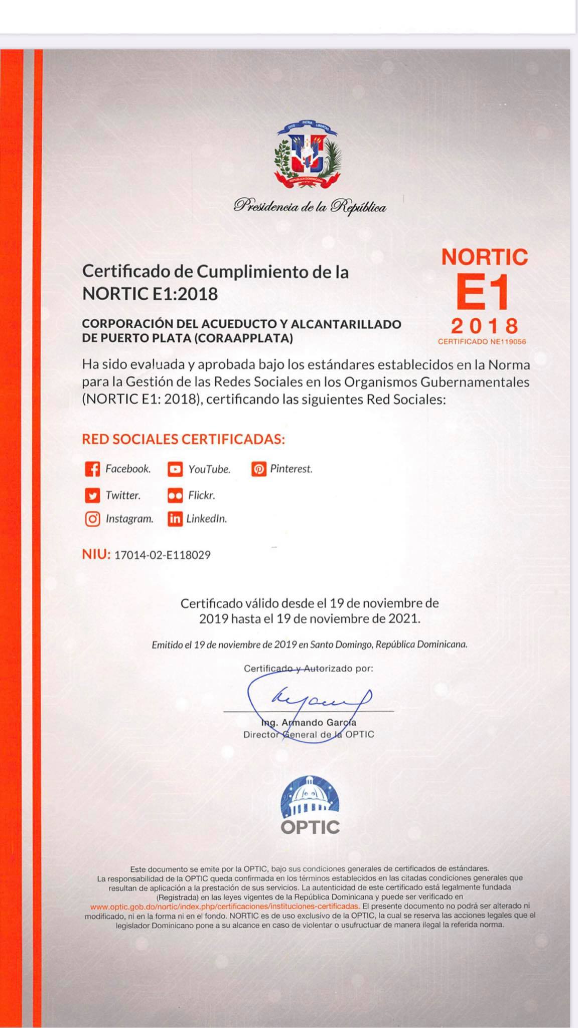 CORAAPPLATA recibe certificación NORTIC-E1 2018